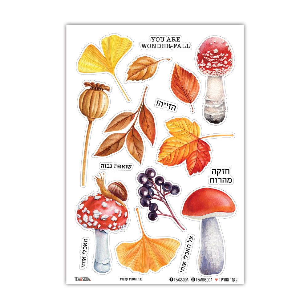 מארז מדבקות ליומן עם איורי פטריות, עלי שלכת ואלמנטים של סתיו. המדבקות ניתנות לשימוש גם כמדבקות לברכות, עיצוב אלבומים, כרטיסי ברכה, אריזות ועוד. מודפס על מדבקה שקופה (מט) שני דפים במארז